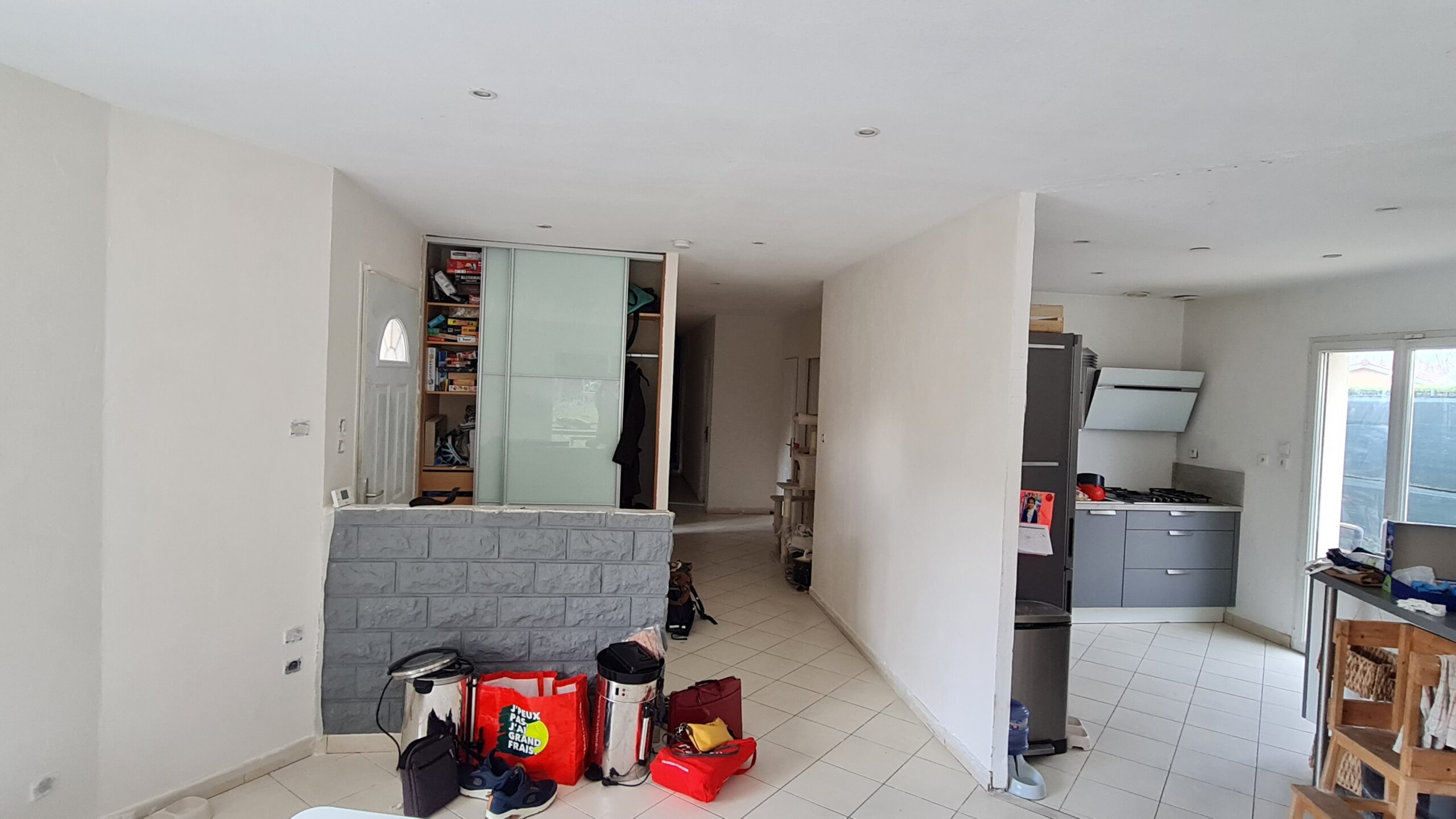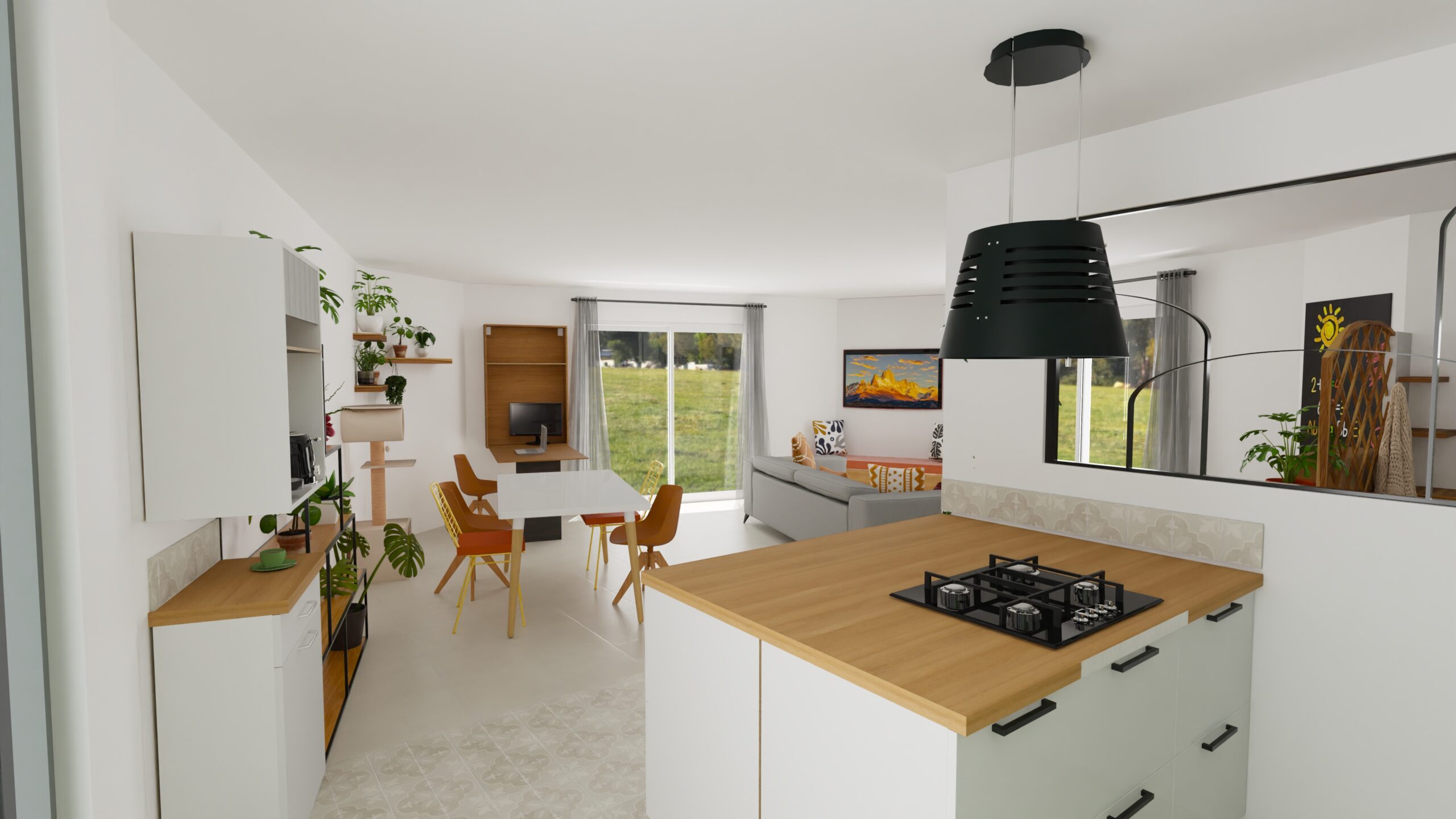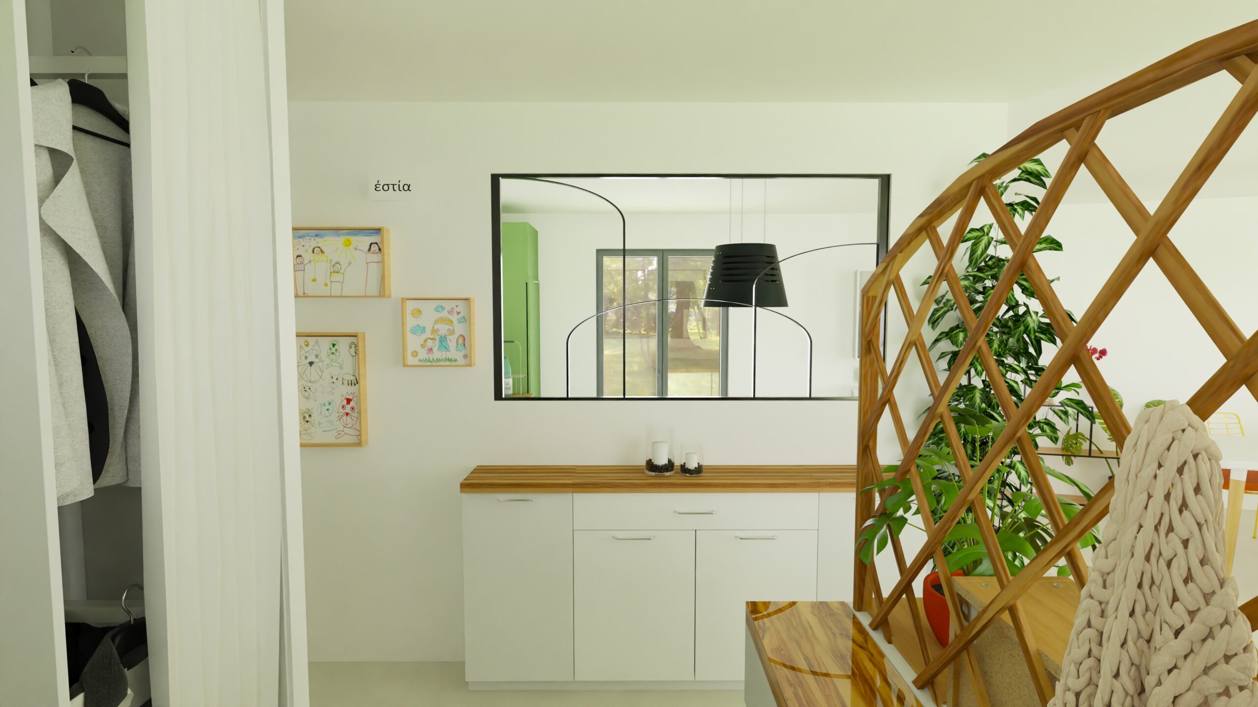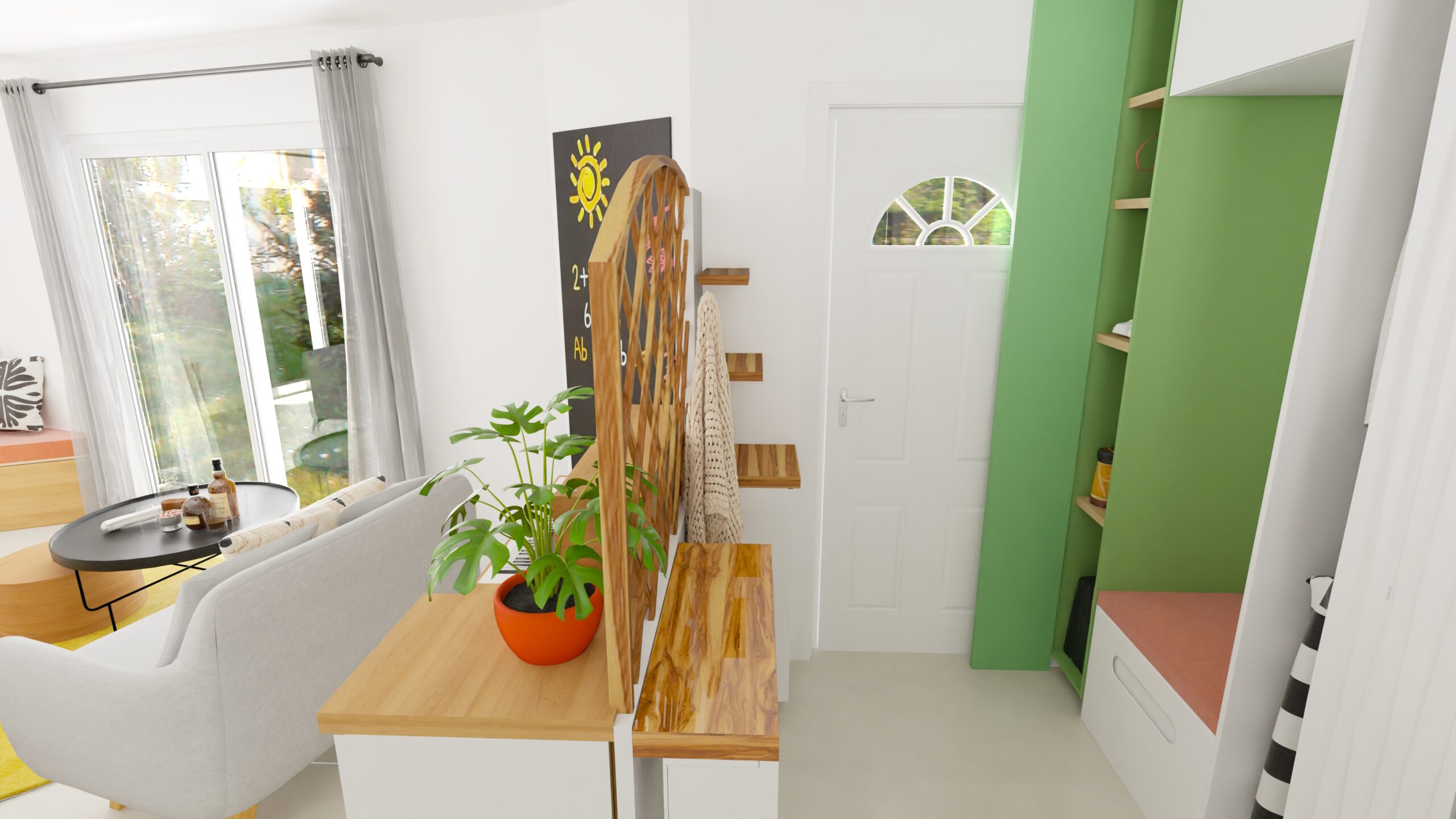 Les espaces salon et salle à manger ont été intervertis pour profiter pleinement de la vue sur la jardin. Le mobilier de salon, redimensionné, a permis de dégager astucieusement un espace pour les loisirs créatifs des enfants, dans un recoin aux formes atypiques jusqu’ici non utilisé. La cuisine et son large ilôt accueillent désormais toute la famille pour les préparatifs. La création d’une verrière illumine l’entrée, repensée avec de multiples rangements fonctionnels. La nouvelle implantation fait la part belle à la circulation et aux nombreuses plantes et fleurs. Le bois se marie aux nuances de vert et terracotta, qui complètent l’ambiance dans un esprit dedans-dehors répondant aux larges baies vitrées donnant sur le grand jardin.