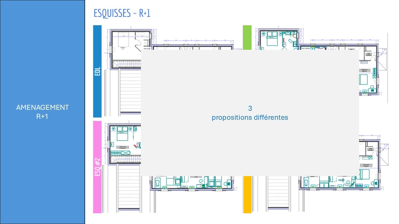 A la recherche d’idées d’aménagement intérieur pour leur projet d’extension, ce jeune couple est ravi face à tant de propositions ! De très belles idées ont surgit de nos rendez-vous en co-création. Et mes idées « hors cadre » ont fait mouche, notamment la suppression de l’escalier initialement prévu, permettant un gain de place (et de budget…) significatif. On s’offre alors le luxe de 2 suites parentales, d’un bureau et même d’une salle de sport qui n’avait pas été envisagée ! La cuisine est également agrandie pour bénéficier d’une double ouverture sur l’extérieur.