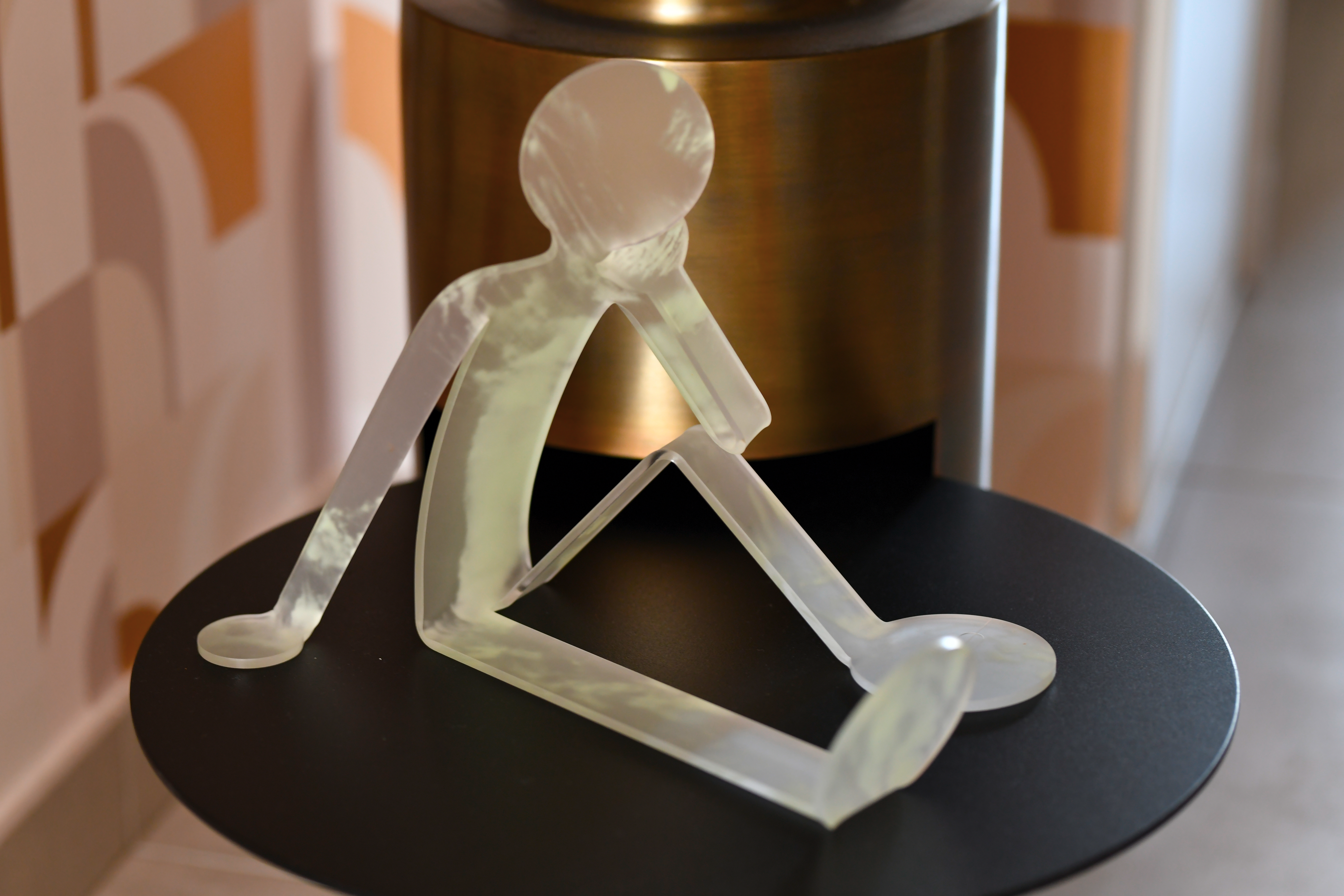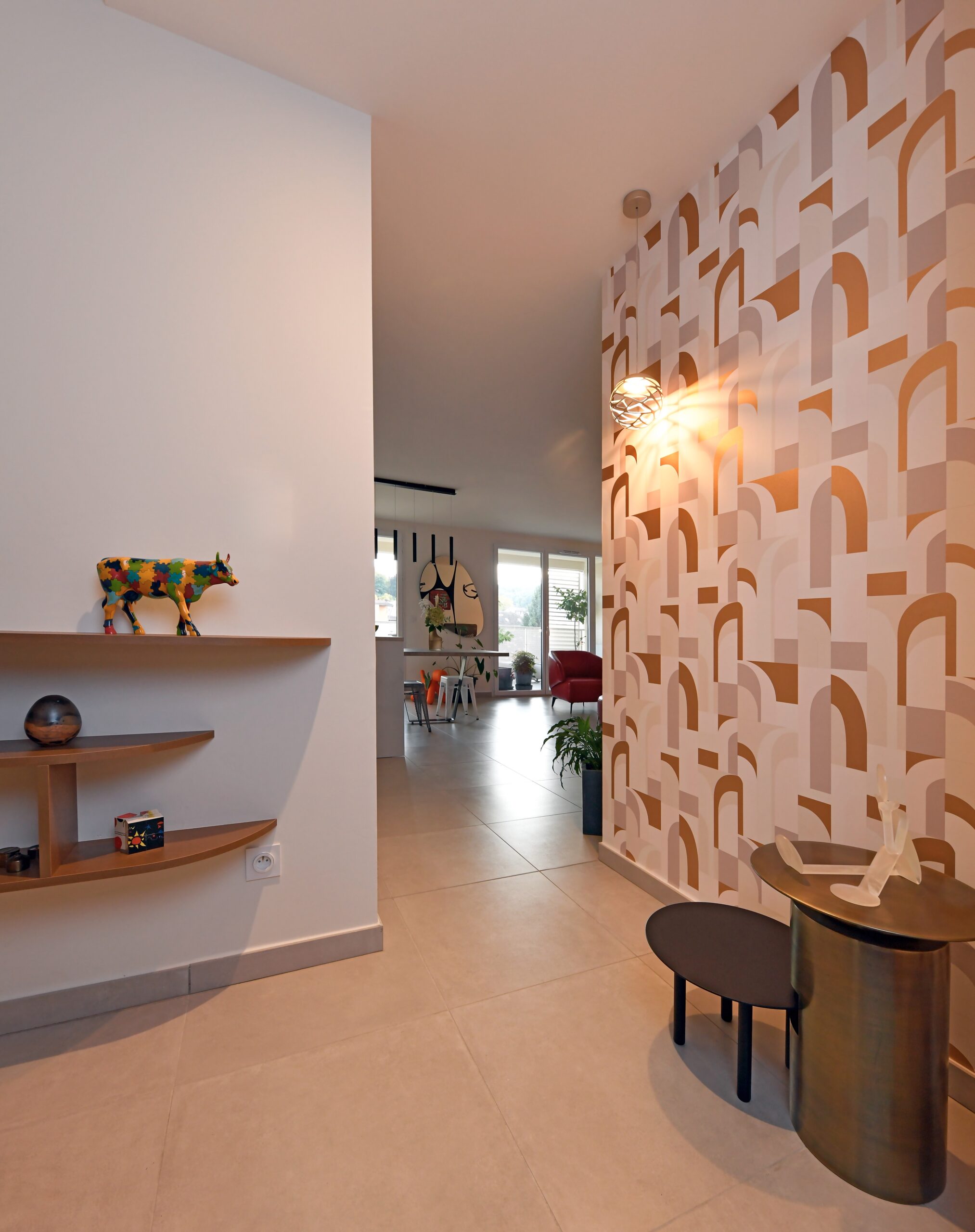 Tout en courbes pour cette entrée aux nuances mordorées. Un penseur, en pièce design icônique et phosphorescente, trouve élégamment sa place sous un éclairage travaillé pour entretenir sa luminosité atypique