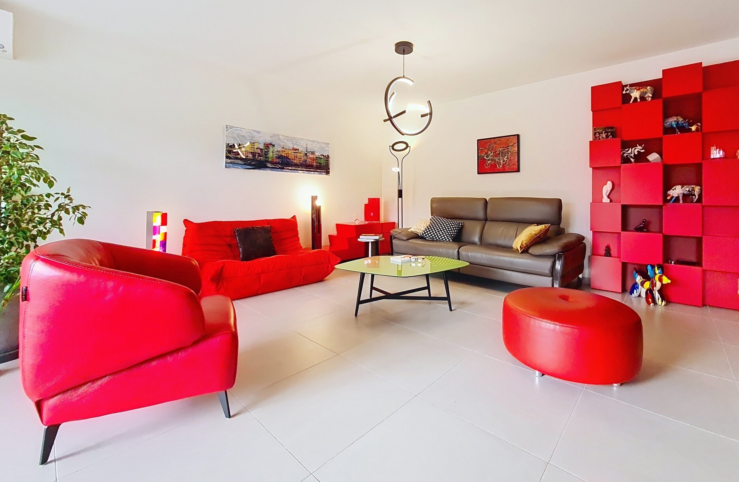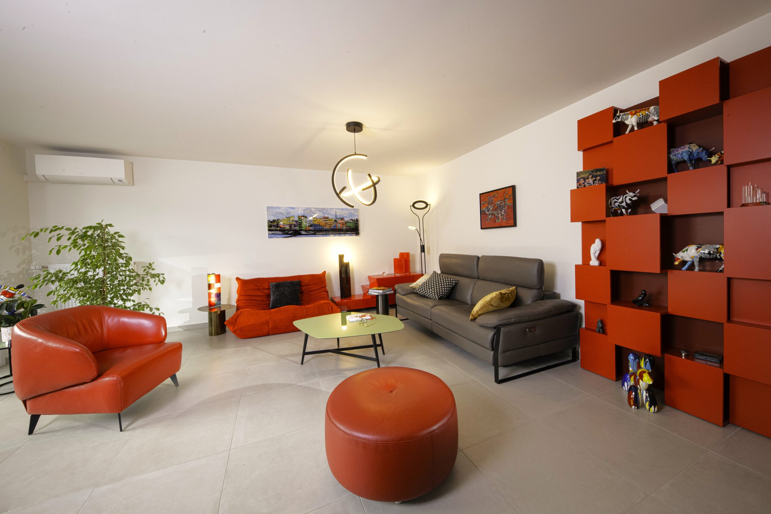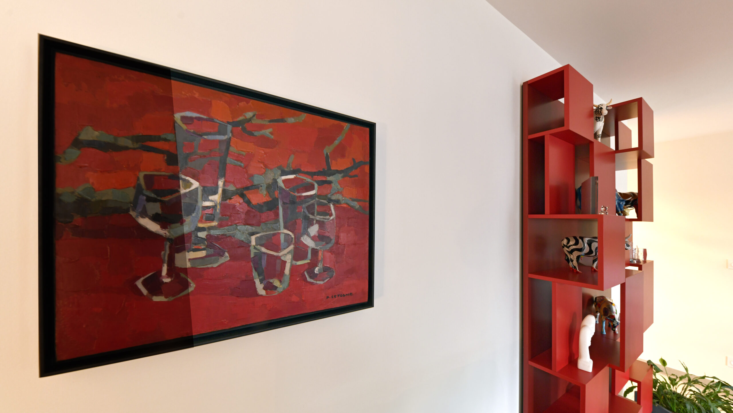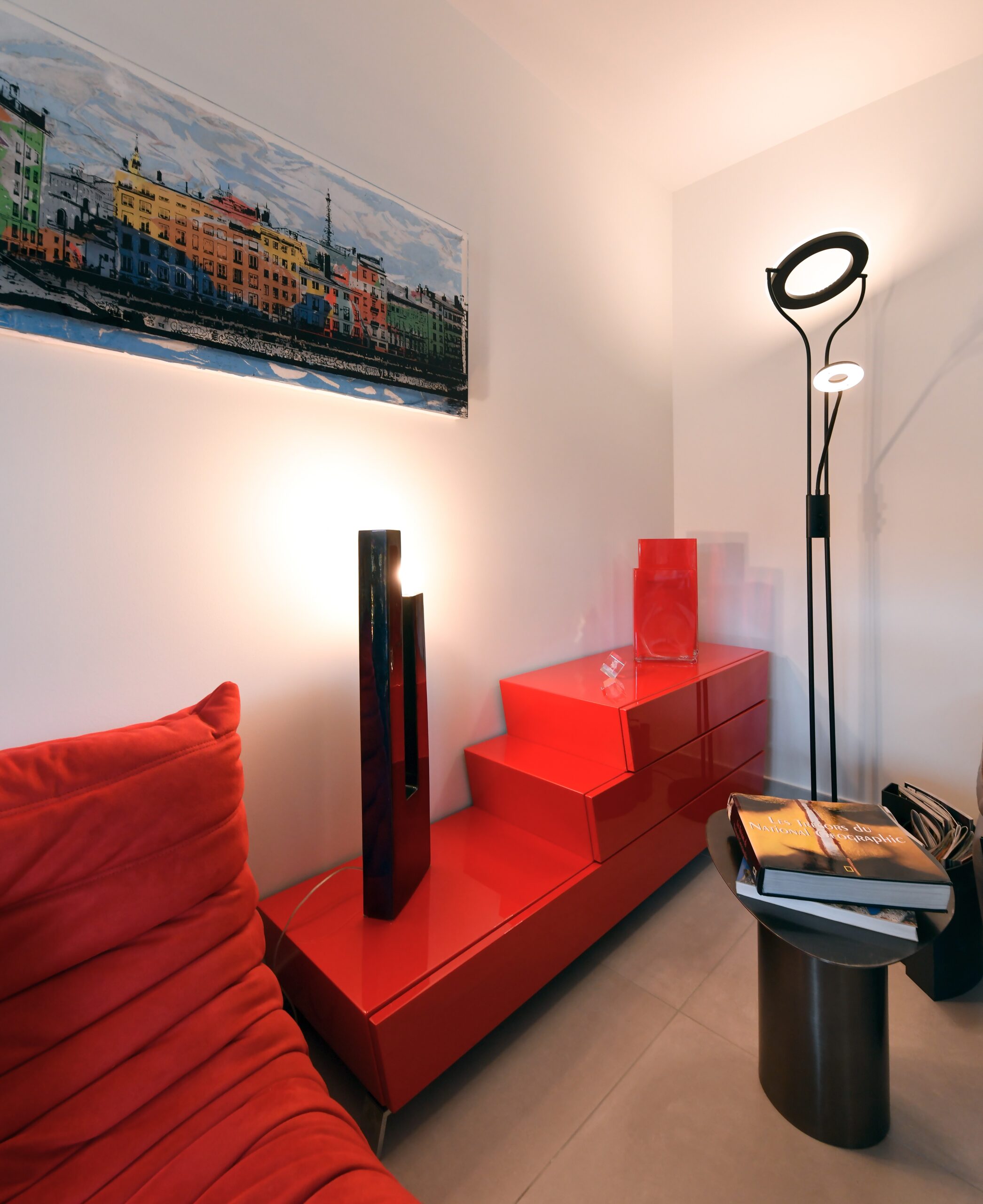 Un rouge profond assumé, décliné en all-over dans toutes les textures, soutient des pièces d’art contemporain colorées, dans un mariage parfait. L’éclairage, travaillé en éléments noirs graphiques, structure l’espace et multiplie la déclinaison possible des ambiances.