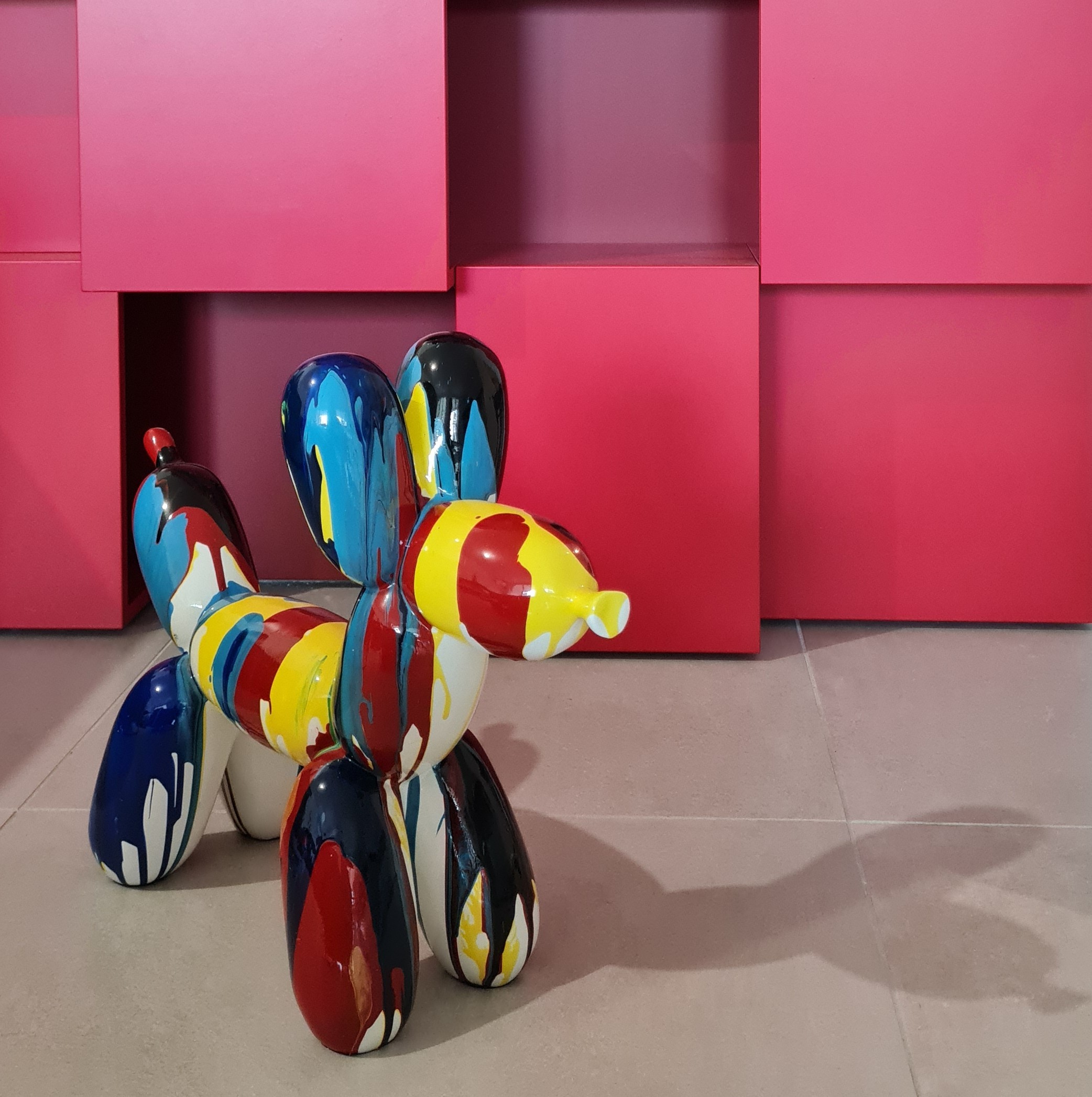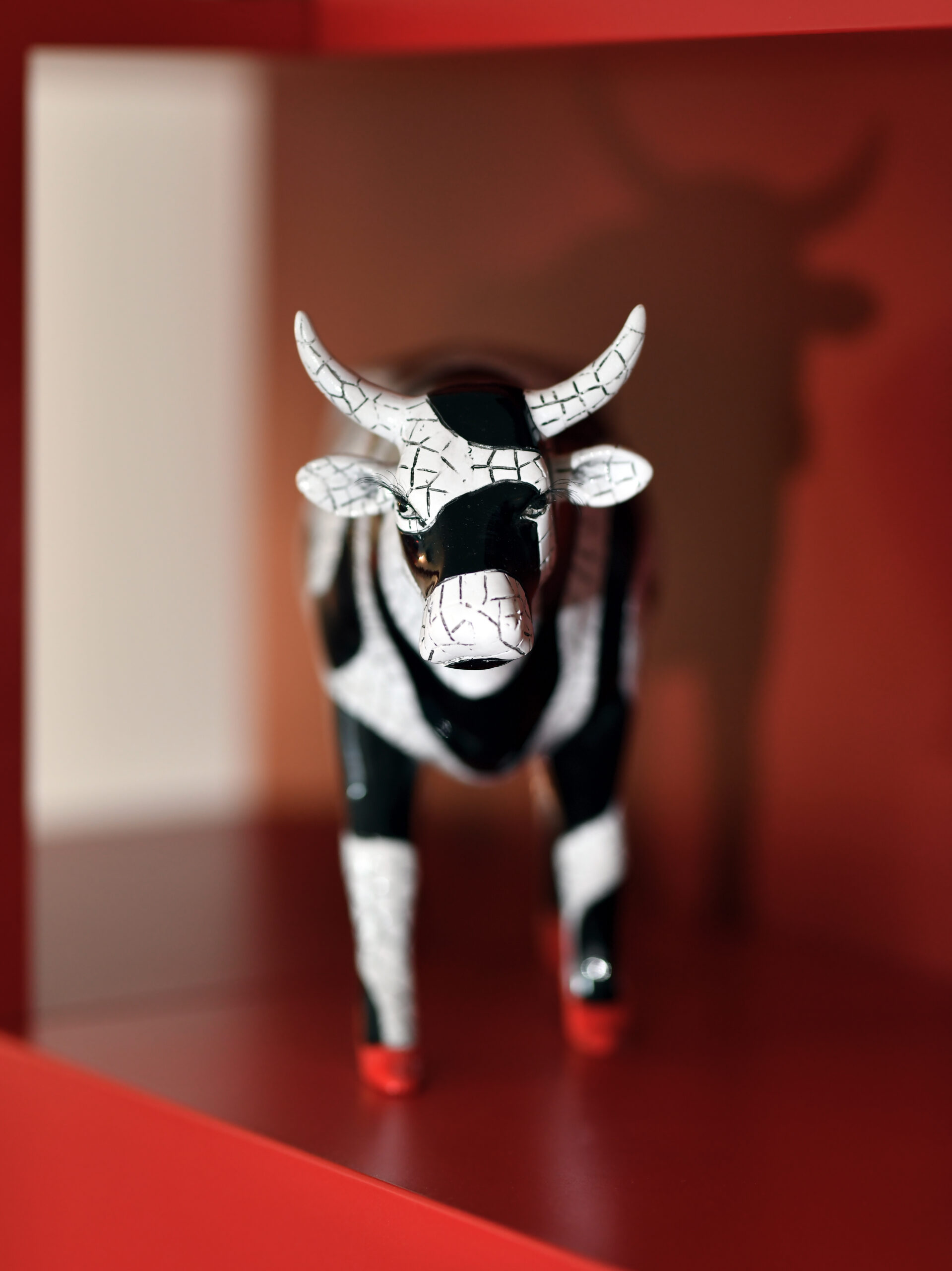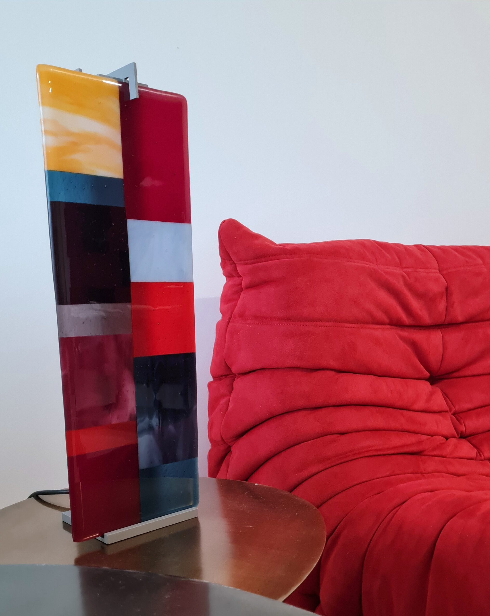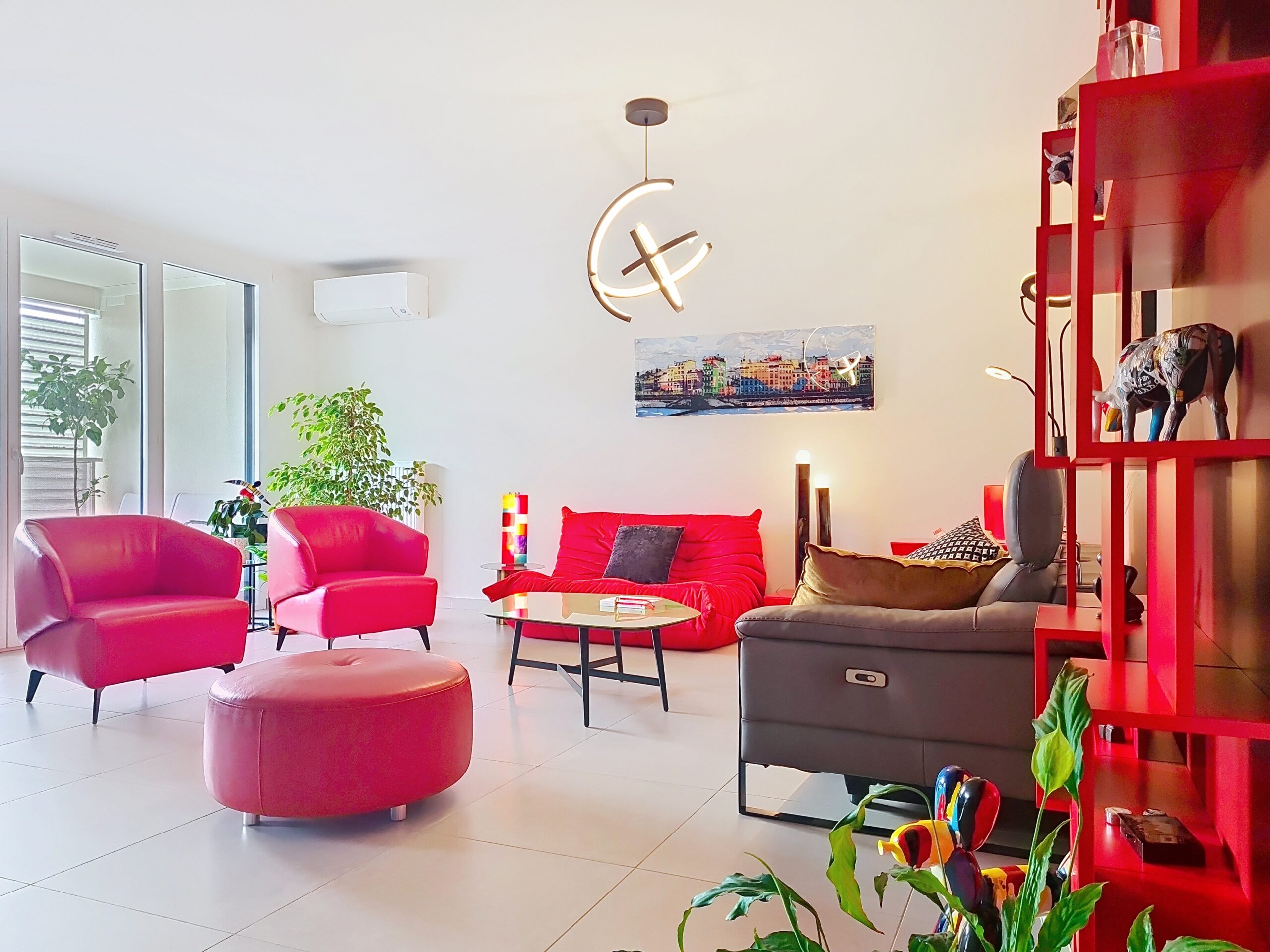 Un rouge profond assumé, décliné en all-over dans toutes les textures, soutient des pièces d’art contemporain colorées, dans un mariage parfait. L’éclairage, travaillé en éléments noirs graphiques, structure l’espace et multiplie la déclinaison possible des ambiances.